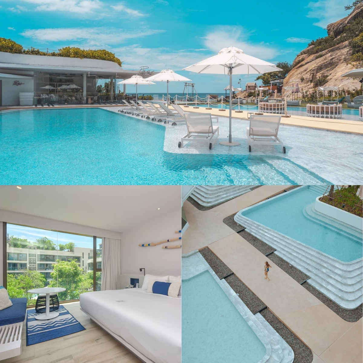 จุดเด่น: รีสอร์ตสุดเท่ที่โดดเด่นด้วยดีไซน์ “Iconic Design” เน้นการใช้โทนสีน้ำเงินเข้ม ตัดกับสีขาวและงานไม้ ไฮไลท์คือสระว่ายน้ำหินอ่อนสีน้ำเงินยาวทอดตัวไปจนถึงหน้าหาด และมีทางเดินลงสระจากหน้าห้องพัก (Pool Access) ที่เป็นมุมถ่ายรูปยอดฮิตในโซเชียลตลอดกาล